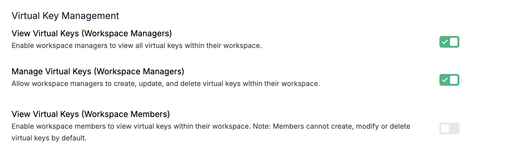 | View Virtual Keys (Workspace Members) | Enable workspace members to view virtual keys within their workspace. Note: Members cannot create, modify or delete virtual keys by default. |